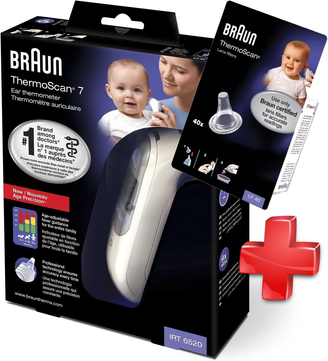 BRAUN ThermoScan 7 Thermomètre avec Fonction Age Précision + Pack 40 x Embouts Braun LF40EULA01 Embouts jetables pour thermomètres auriculaires Braun