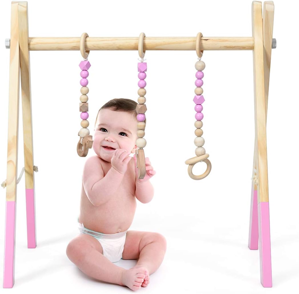 Costway Portique d’Eveil, Arche de Jeux pour Bébé en Bois avec Jouets, Centre d'Activité Pliable, Cadeau de Naissance, 4 Couleurs Nature/Vert/Gris/Rose (Rose)