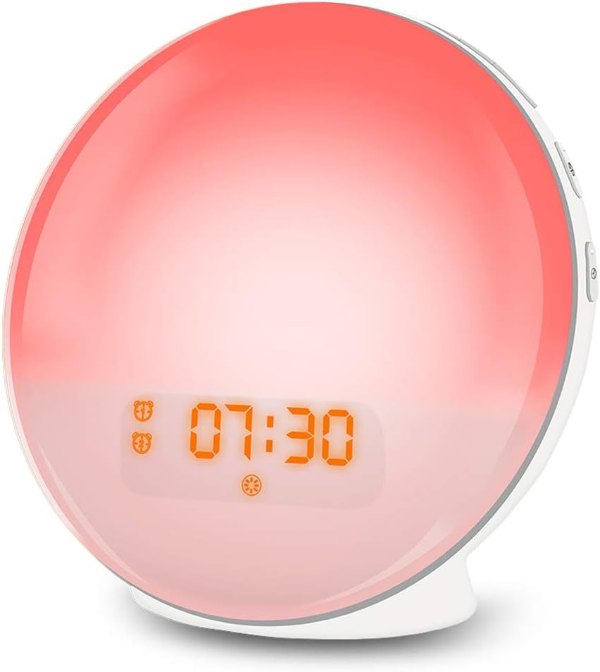 Double Réveil Lumière LED, Lampe Réveil Radio avec simulation de lever de soleil, Réveil Lumineux Matin du jour avec 7 couleurs lumières, 7 tons d'alarme réveil enfants veilleuse lampe de chevet [Classe énergétique A++]