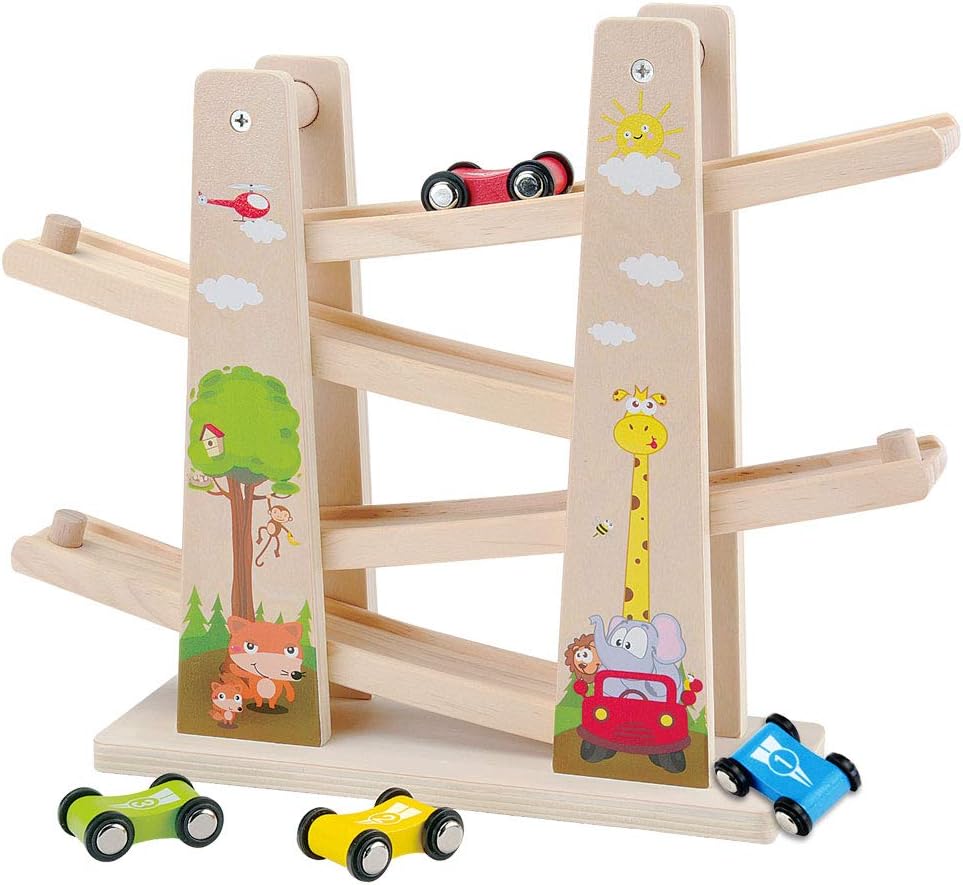 Jouet en Bois pour Bébé/Enfant, Jouet de Voiture - Rampe de Course de la Forêts - Circuit Zig Zag avec Parking 4 * Voitures,Jouet Educatif comme Cadeau pour Tout-Petits.