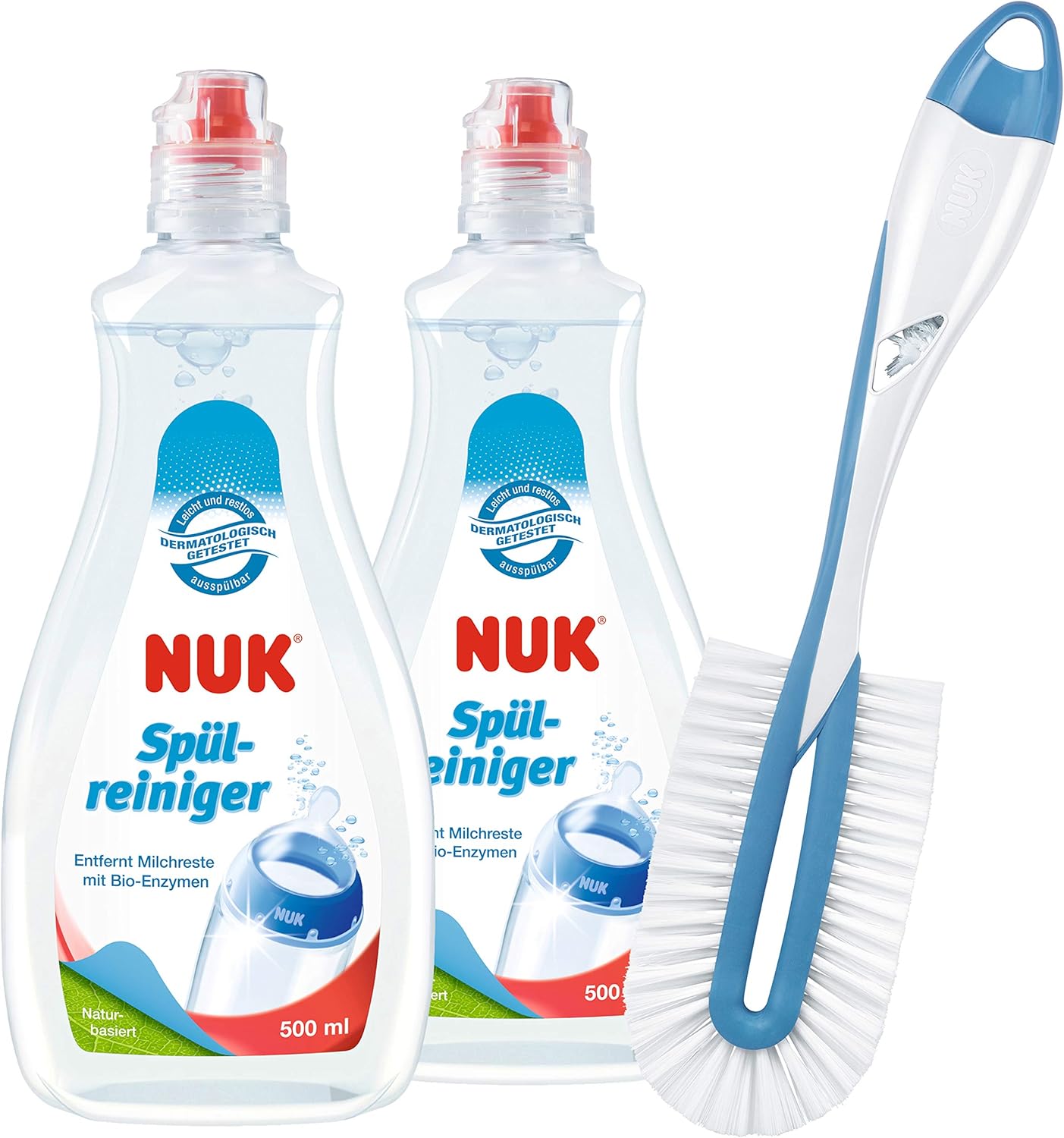 NUK liquide nettoyant pour biberons et goupillon, 2 flacons de liquide vaisselle (500ml), 1 goupillon à biberons et tétines, sans parfum, pH neutre - Coloris aléatoire